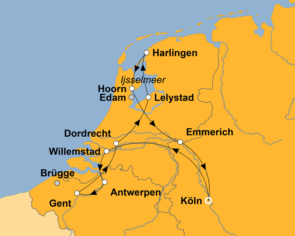 Ein Hoch auf Köln! Das lässt sich locker beim Kölsch aussprechen. Hier starten Sie auch zu Ihrer Erlebniskreuzfahrt durch Benelux. Dass Antwerpen den zweitgrößten Seehafen Europas hat, ist bekannt, aber weniger, dass die Stadt im 15. und 16. Jahrhundert eine der größten Städte der Welt war. Neben weiteren sehenswerten Städten wie Gent, Horn und Dordrecht kreuzen Sie unter anderem auf dem Wattenmeer und dem riesigen niederländischen See Ijsselmeer. Und jetzt schließt sich der Kreis. Probieren Sie eine typische Fischspezialität, Kibbelinge oder einfach nur Matjes. Das bietet sich hier am Wasser an.