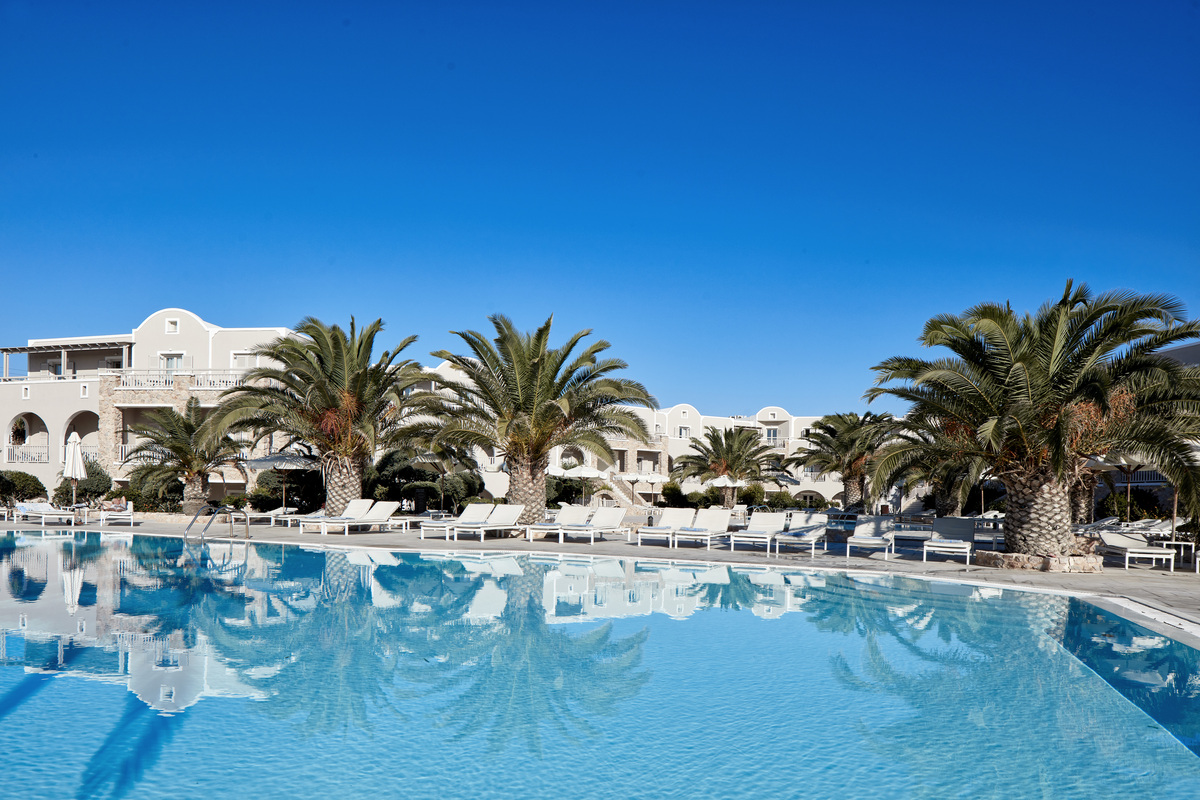 Lage & Ausstattung: Die moderne und sehr schöne Hotelanlage ist nur durch die Uferstraße vom Strand getrennt und liegt im sehr beliebten Ort Perissa im Süden von Santorin. Der Ort besticht durch