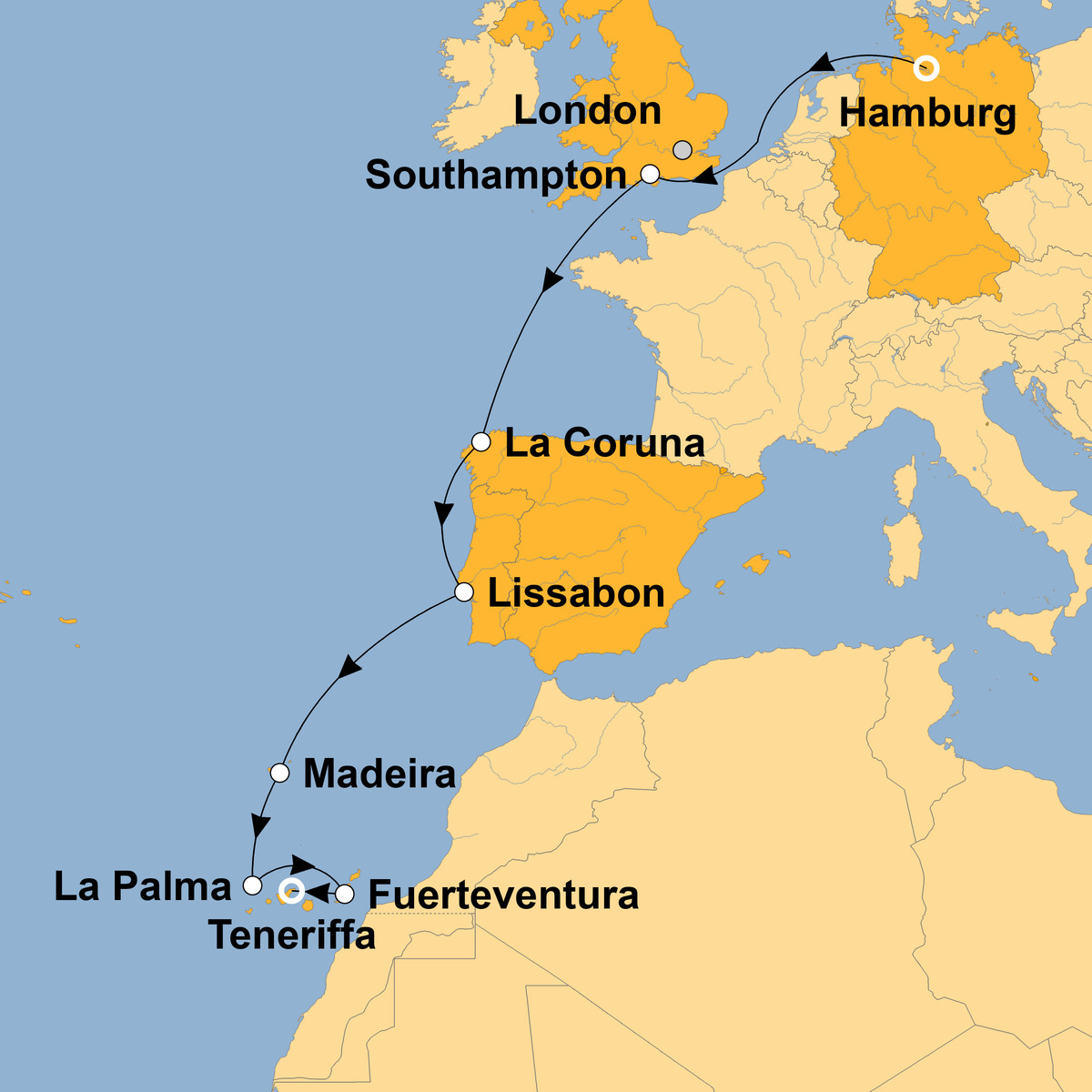 Freuen Sie sich auf eine Europa-Städtereise an Bord von Mein Schiff Relax. Ihre 13-tägige Kreuzfahrt führt Sie unter anderem in so spannende Städte und Häfen wie nach London, La Coruña in Nordspanien und ins bezaubernde Lissabon. Weiter geht es nach Madeira und zu den Kanarischen Inseln La Palma und Fuerteventura. Auf Teneriffa endet Ihre erlebnisreiche Reise.