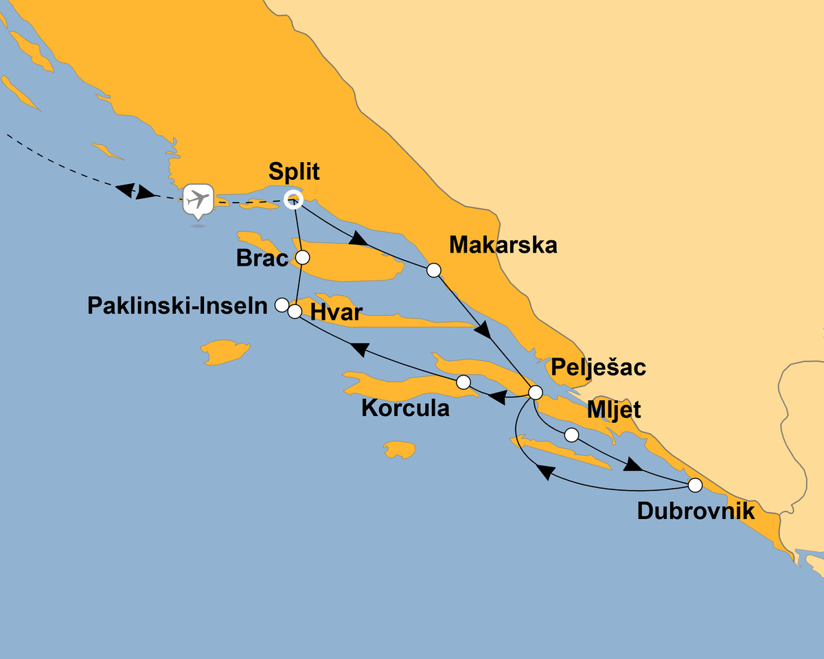 Split - Makarska - Pelješac - Mljet - Dubrovnik - Šipan/Trstenik - Korčula - Paklinksi-Inseln - Hvar - Brač - Split