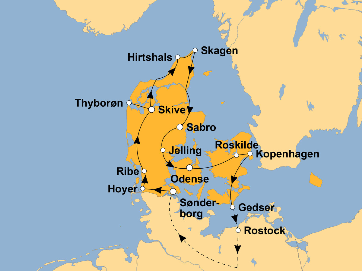 Im komfortablen Reisebus beginnt Ihre Reise in Richtung Dänemark. Freuen Sie sich auf die kommenden abwechslungsreichen Tage, denn Sie lernen das facettenreiche Reiseland zwischen Nord- und Ostsee wirklich ausführlich kennen. Nach dem Check-in im dänischen Sønderborg sowie dem ersten gemeinsamen Abendessen erfolgt der gemütliche Ausklang des Tages.
