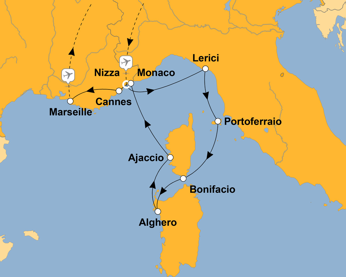 Ihre Reise beginnt mit einem Aufenthalt in Nizza, wo Sie während einer Stadtbesichtigung die schönsten Ecken und den bekannten Blumenmarkt erkunden. Dann geht es für Sie an Bord des größten Segelschiffs der Welt. Die ROYAL CLIPPER bringt Sie zu so illustren Häfen wie Monaco. Doch nicht nur die Côte d'Azur steht auf dem Besuchsprogramm, Sie ankern auch im quirligen, mediterranen Alghero (Sardinien), in Napoleons Geburtsstadt Ajaccio (Korsika), der Hauptstadt der Insel Elba Portoferraio und der "La Perla del Golfo" Lerici, an der ligurische Riviera (Italien). Neben kulturellen Entdeckungen steht aber auch Wassersport nichts im Wege. Sie können am Strand von Sant´Amanza entspannen oder die von der Crew angebotenen Wassersportangebote nutzen.