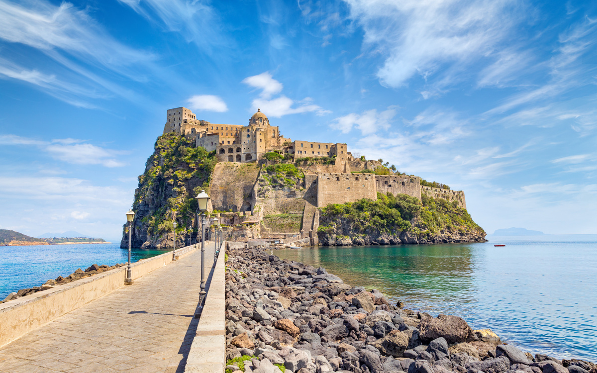 Heute entdecken Sie mit Ihrer Reiseleitung einen der eindrucksvollsten Orte Ischias: das historische Castello Aragonese. Gemeinsam spazieren Sie durch die malerischen Gassen von Ischia Ponte bis hinunter zum Steg, der direkt zur Festung führt – majestätisch thront sie auf einem Felsen im Meer und ist über eine Fußgängerbrücke mit dem Ort verbunden.