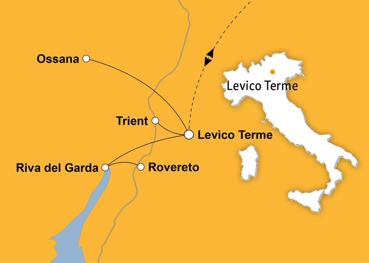 Im Herzen des Trentinos liegt das Hotel in fußläufiger Entfernung (ca. 200 m) zum Levico-See im Thermalkurort Levico Terme auf 500 m ü.d.M. Das Ortszentrum ist ebenfalls zu Fuß erreichbar.