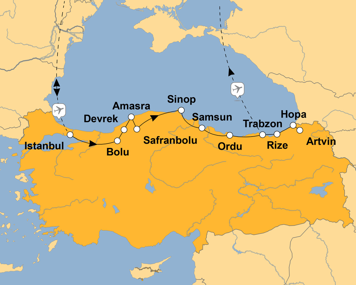 Nach erlebnisreichen Tagen am Schwarzen Meer fahren Sie zum Flughafen von Trabzon. Von dort fliegen Sie über Istanbul zurück nach Deutschland. Während Sie in den Flieger steigen, klingt die Vielfalt dieser Reise nach – von den sanften Küstenlandschaften bis zu den schneebedeckten Bergen des Kaukasus.