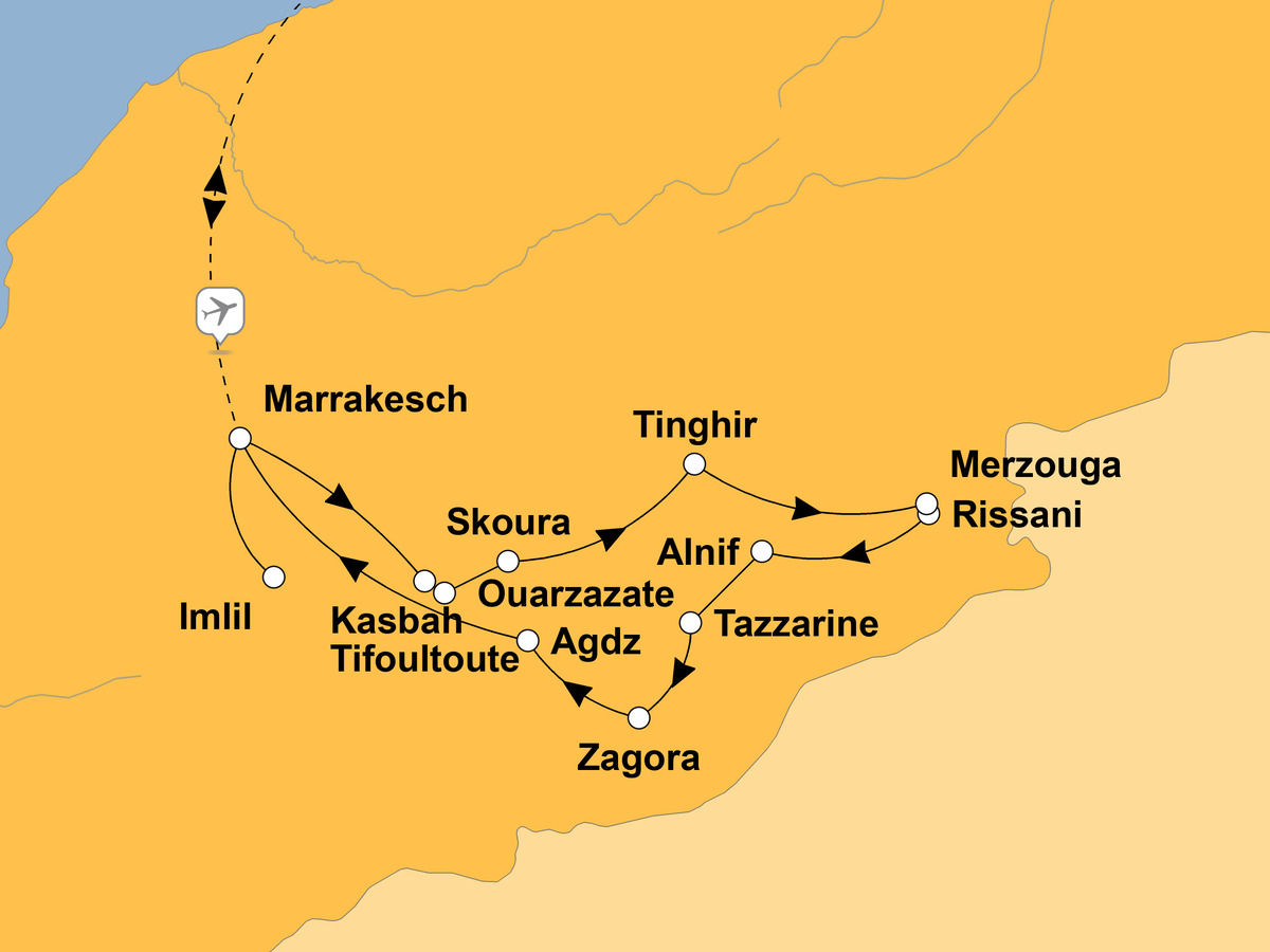 Zwischen Rissani, Alnif und Tazzarine sammeln Sie neue Eindrücke, bevor die märchenhafte Kasbah Ait Benhaddou und schließlich Marrakesch die Reise perfekt abrunden. Ein Abenteuer voller Farben, Düfte, Geschichten und unvergesslicher Momente, das Sie noch lange begleiten wird.